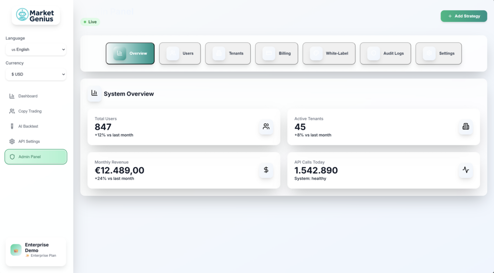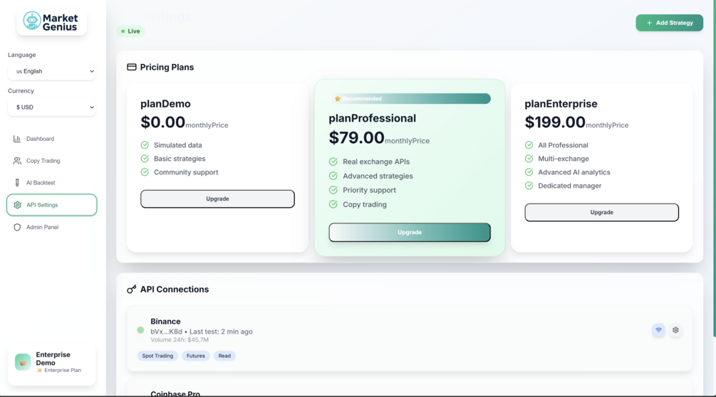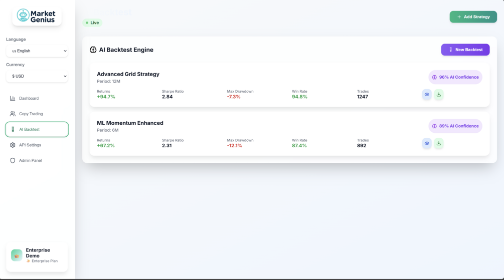 - Strategy management with AI-powered backtesting